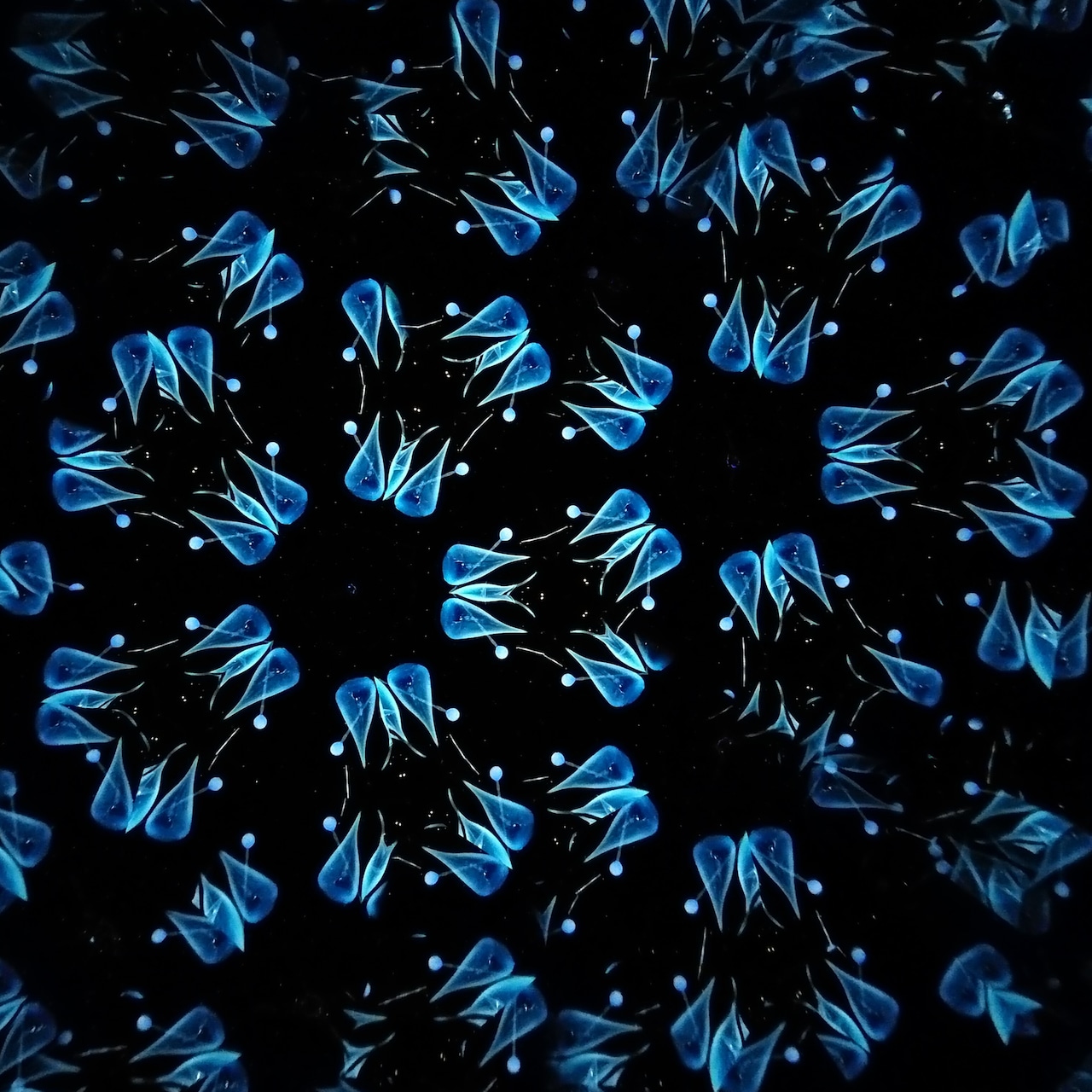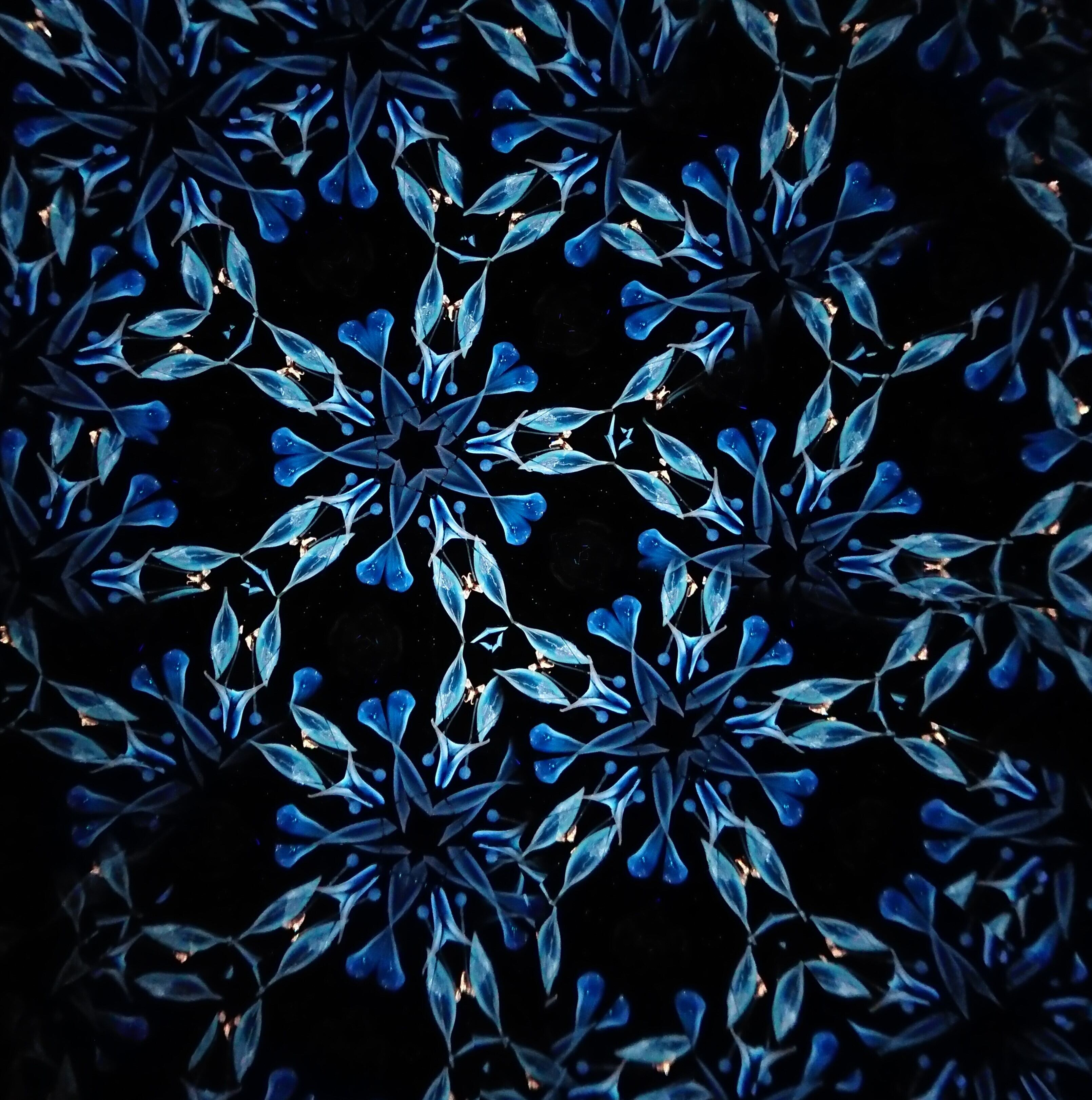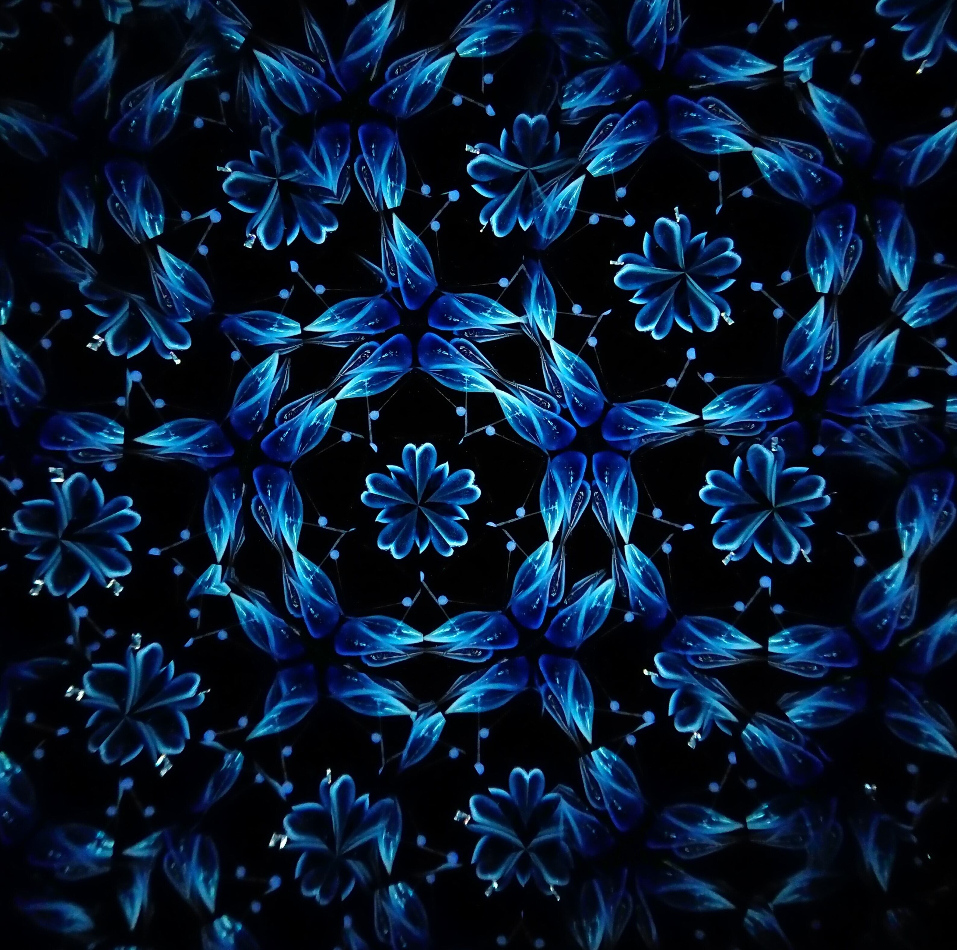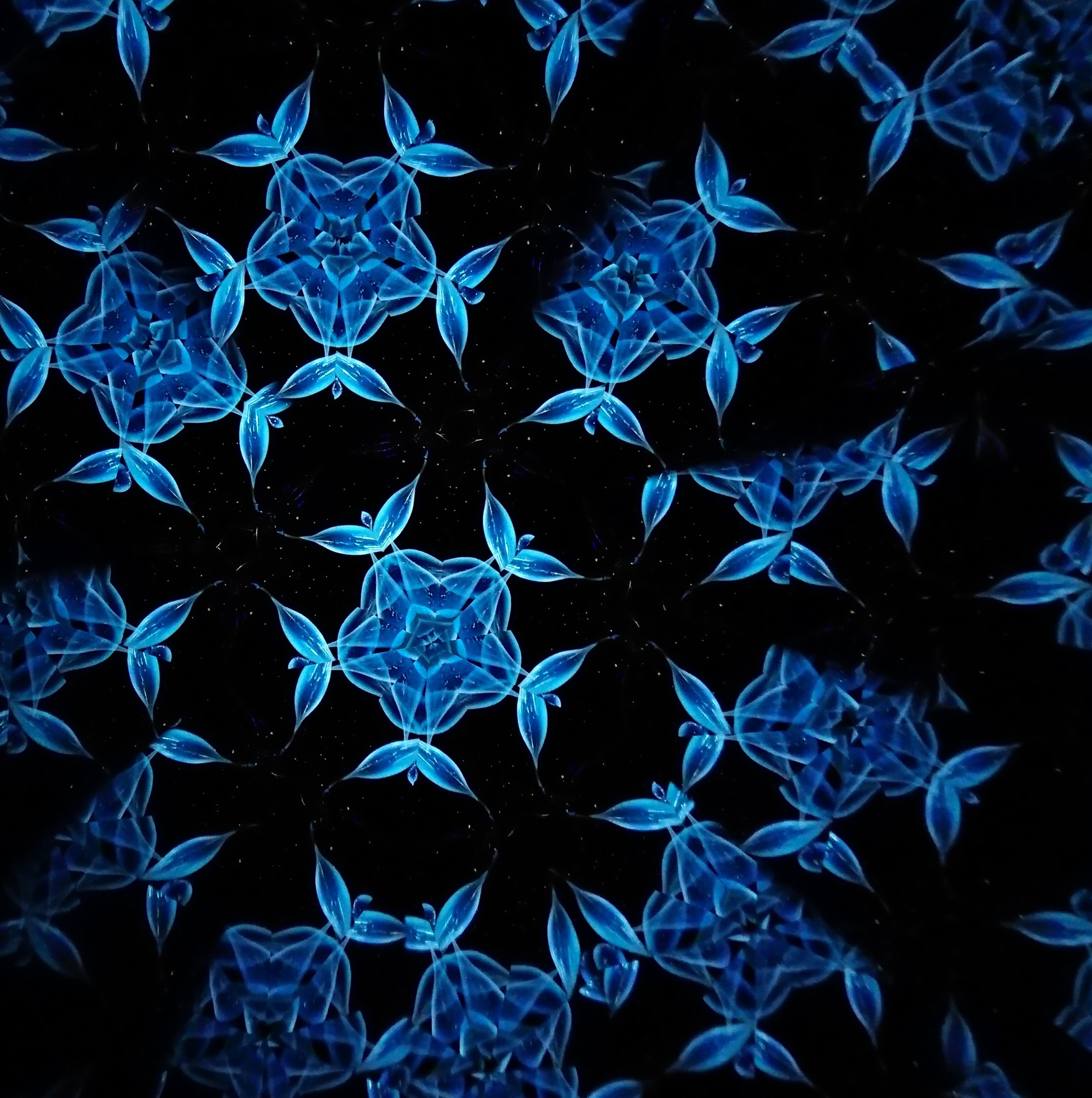 高濃度のグリセリンの中を透明感のある青いオブジェクトがゆっくり動き、変化してゆきます。