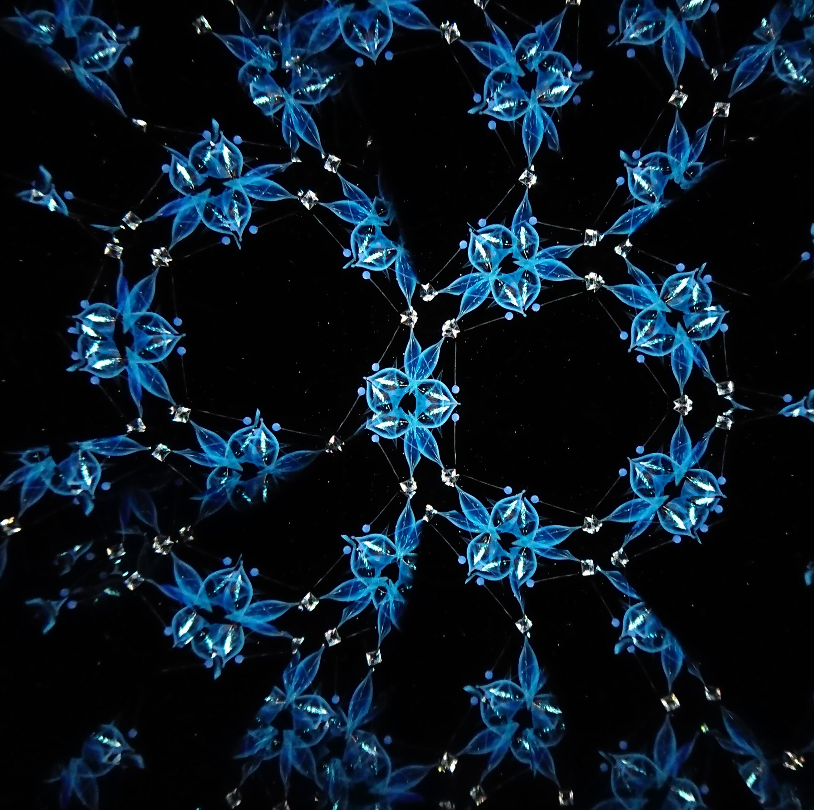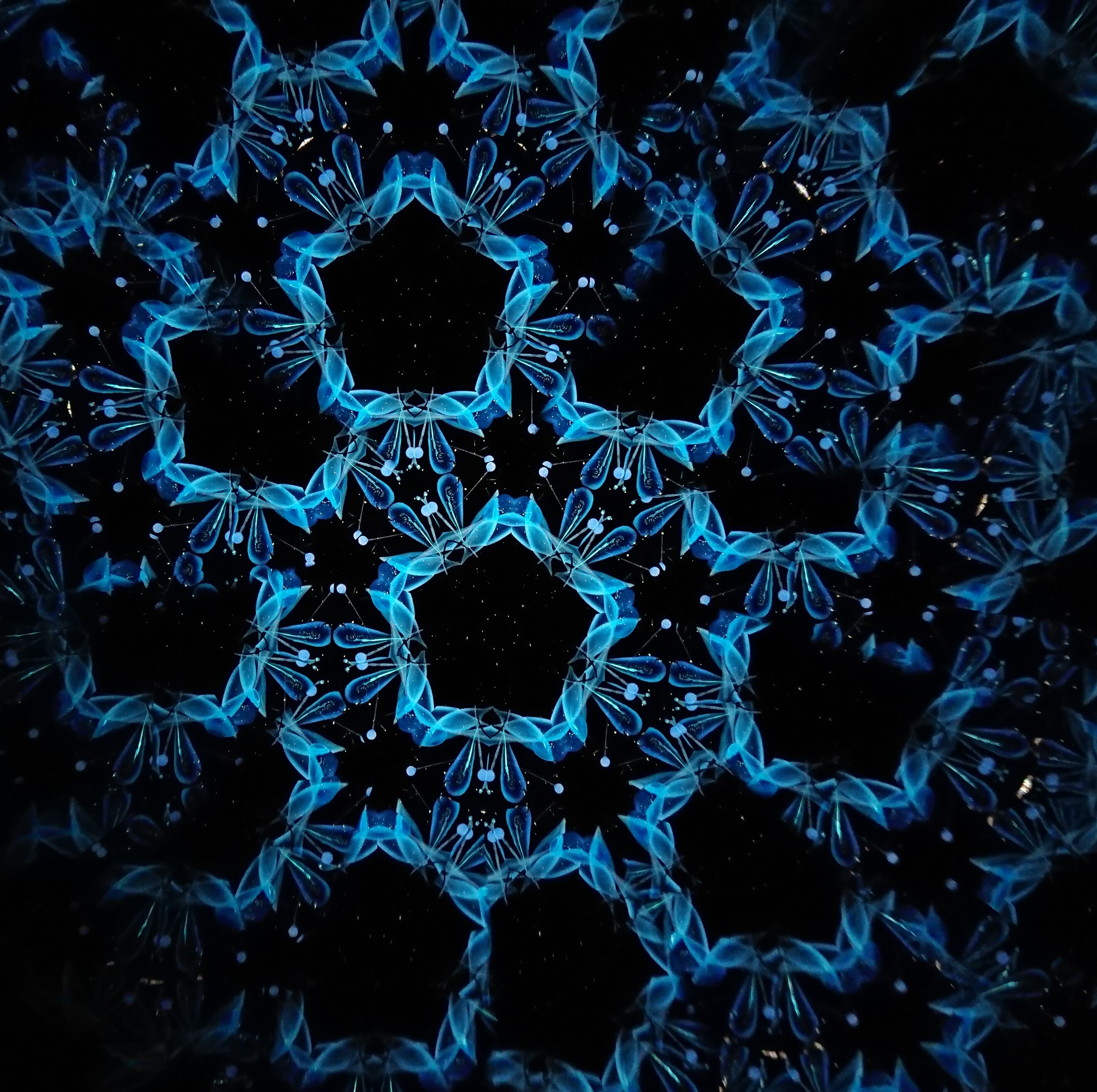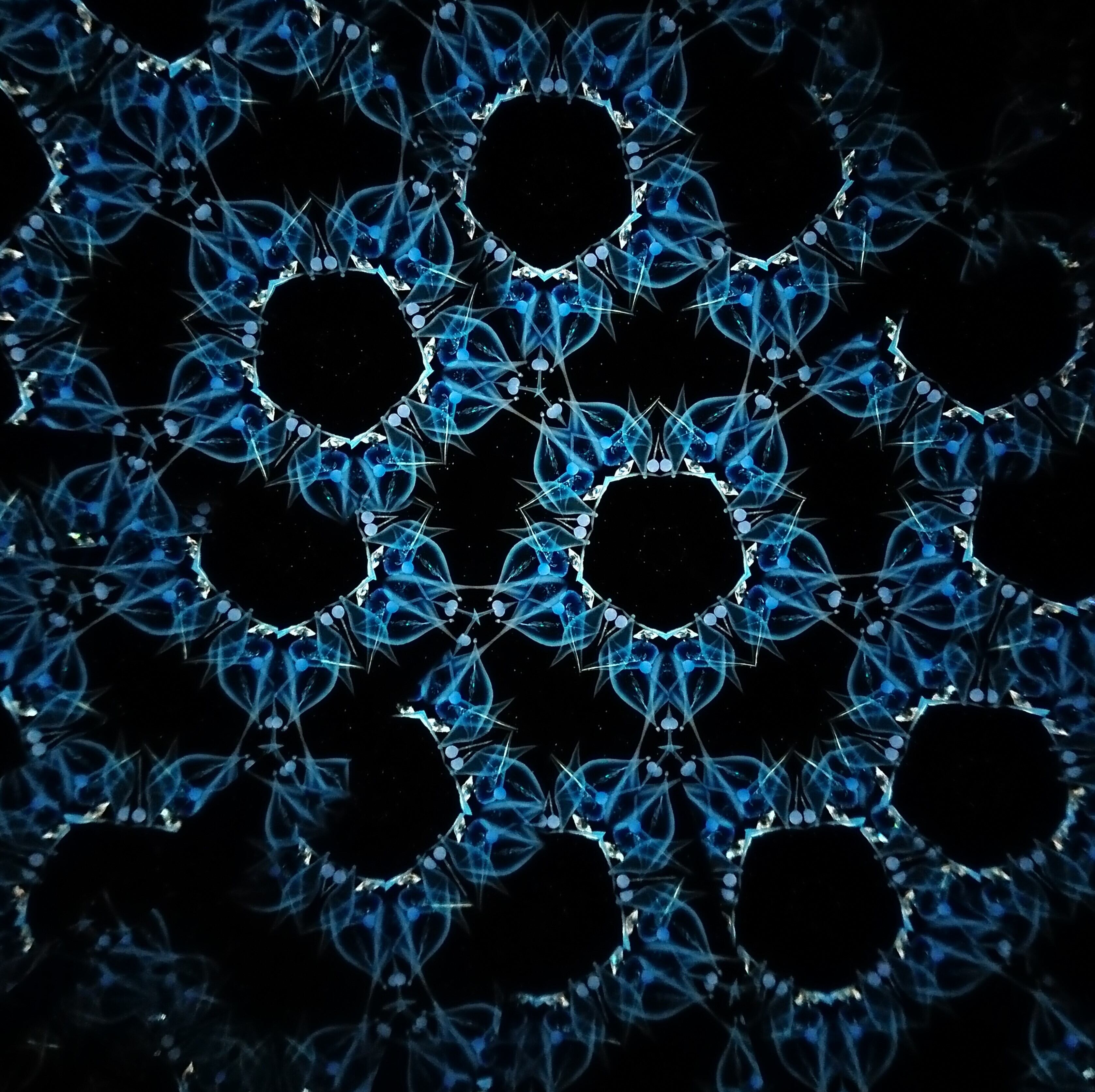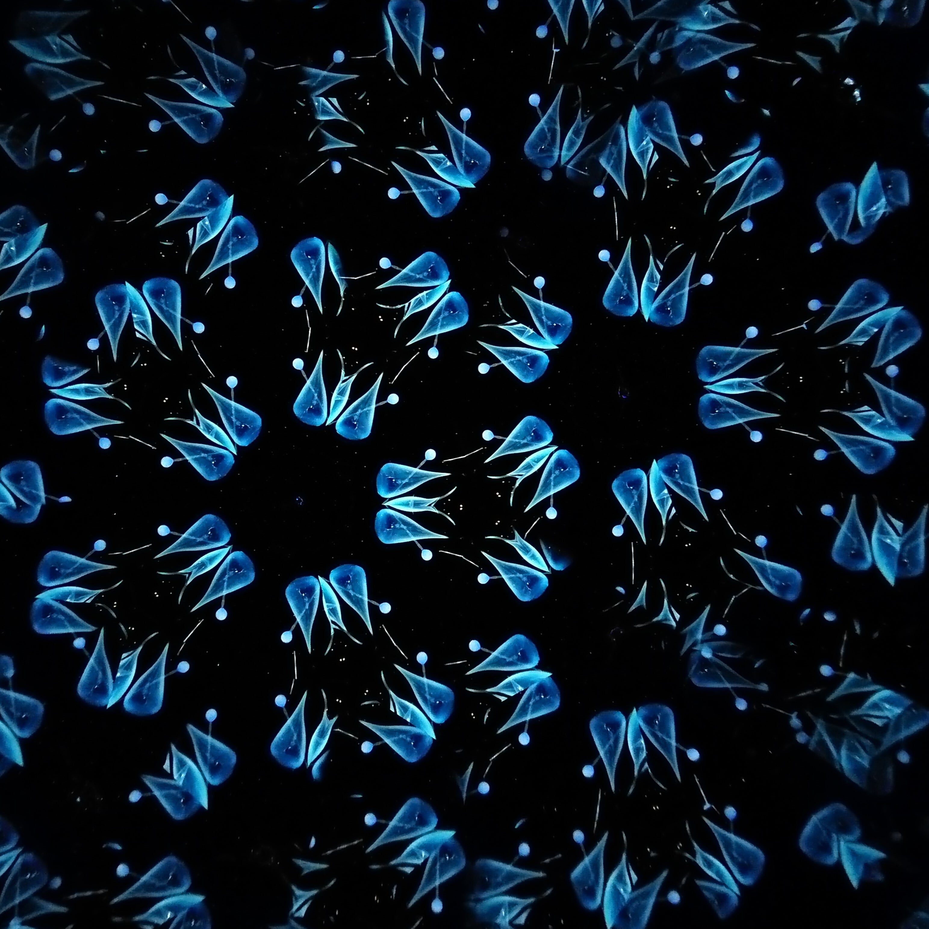 高濃度のグリセリンの中を透明感のある青いオブジェクトがゆっくり動き、変化してゆきます。