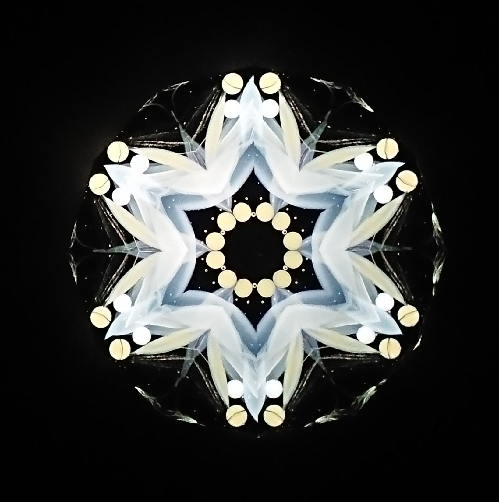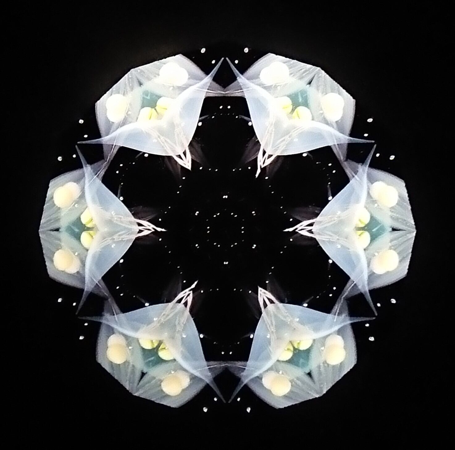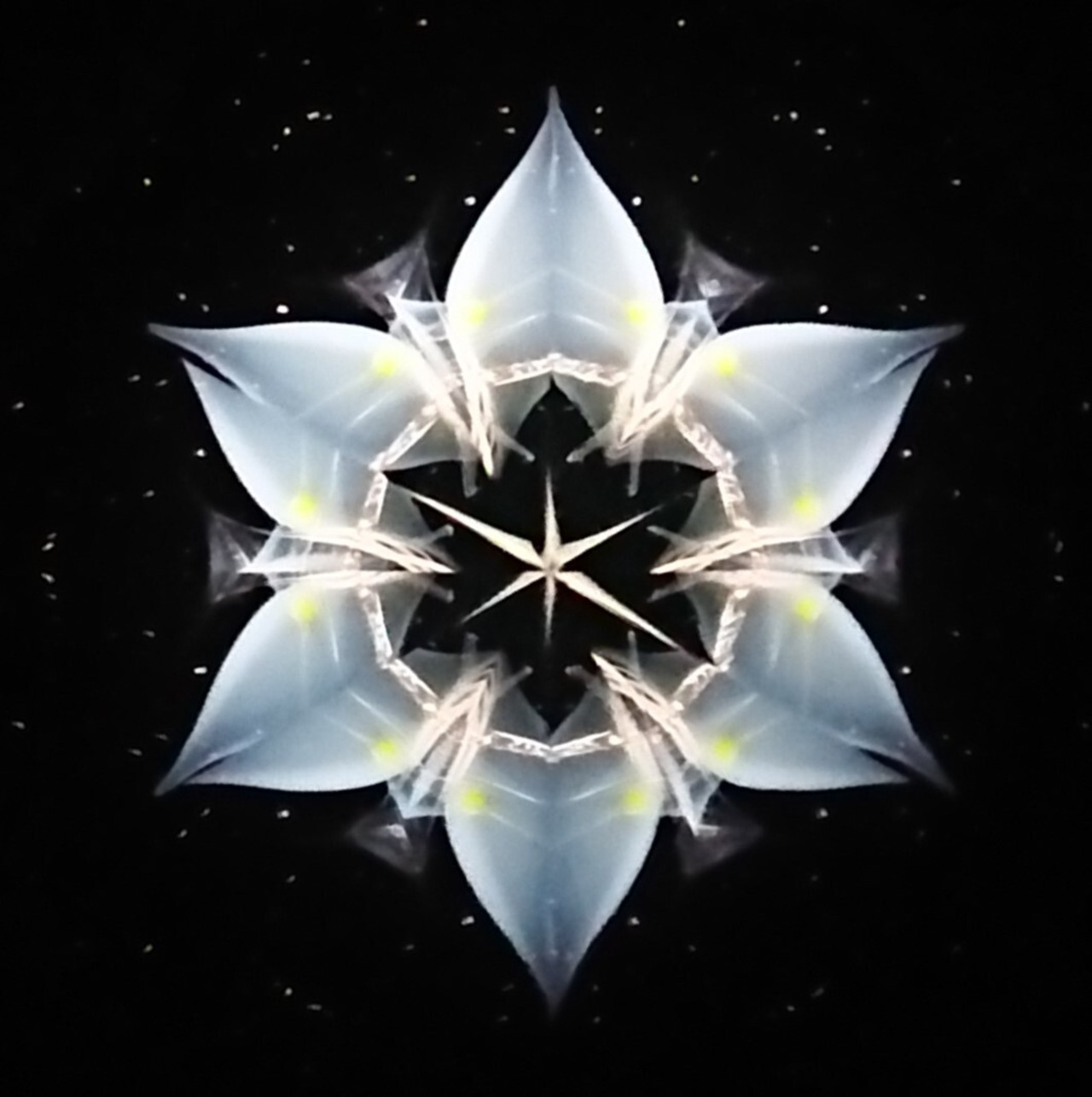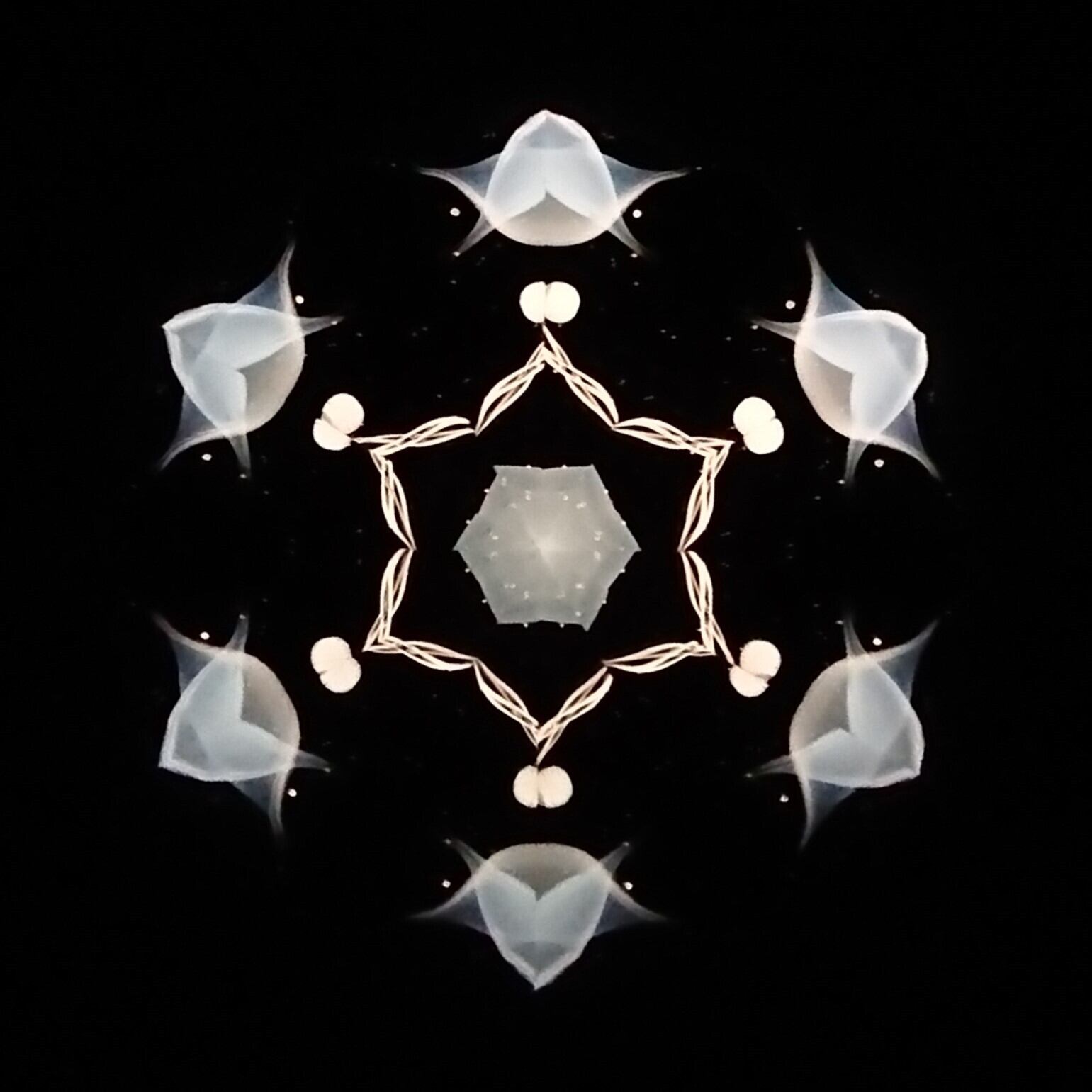 高濃度のグリセリンの中を、半透明の白いオブジェクトが重なり合いながらゆっくり動き、変化してゆきます。