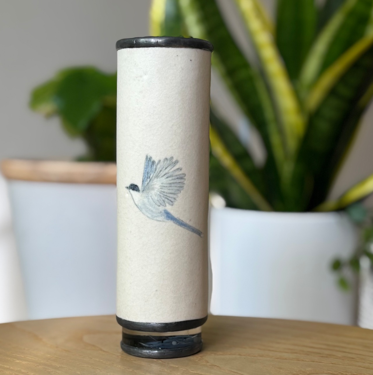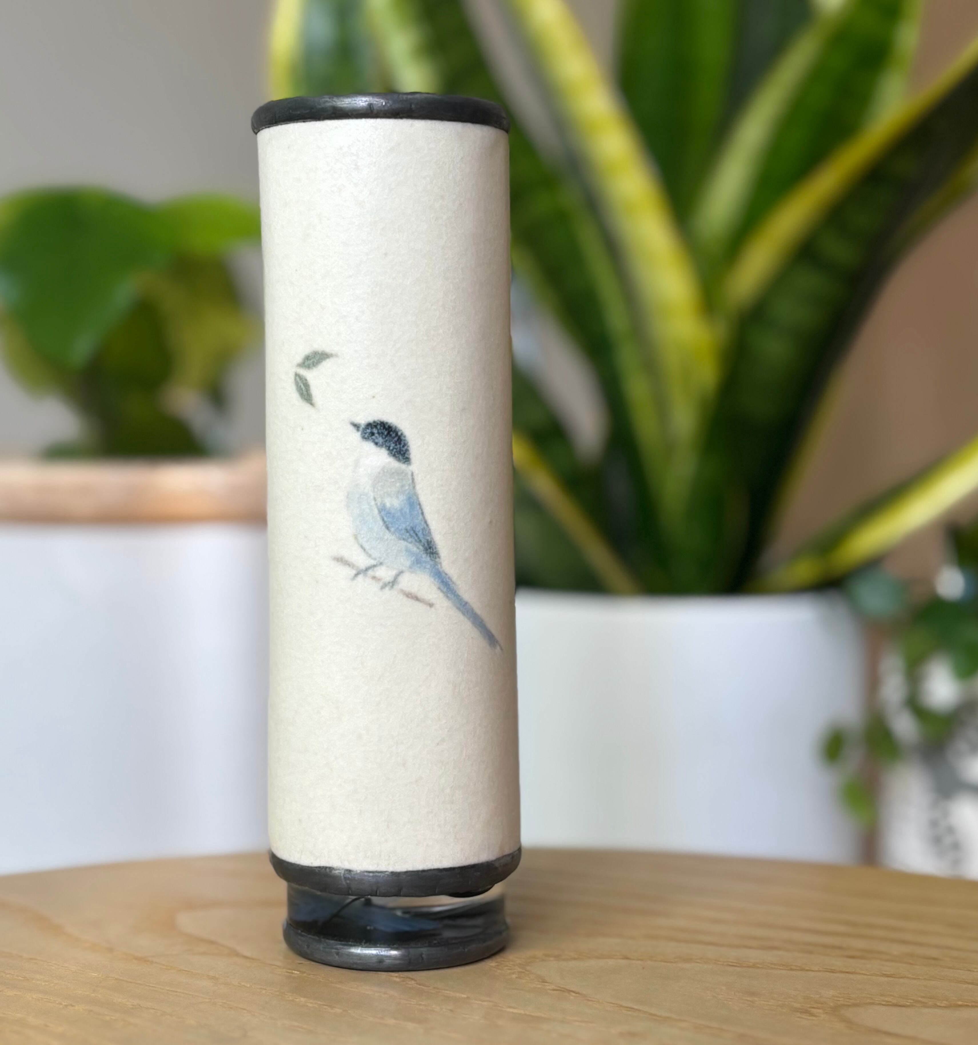 陶の筒に描いた鳥はオナガ。