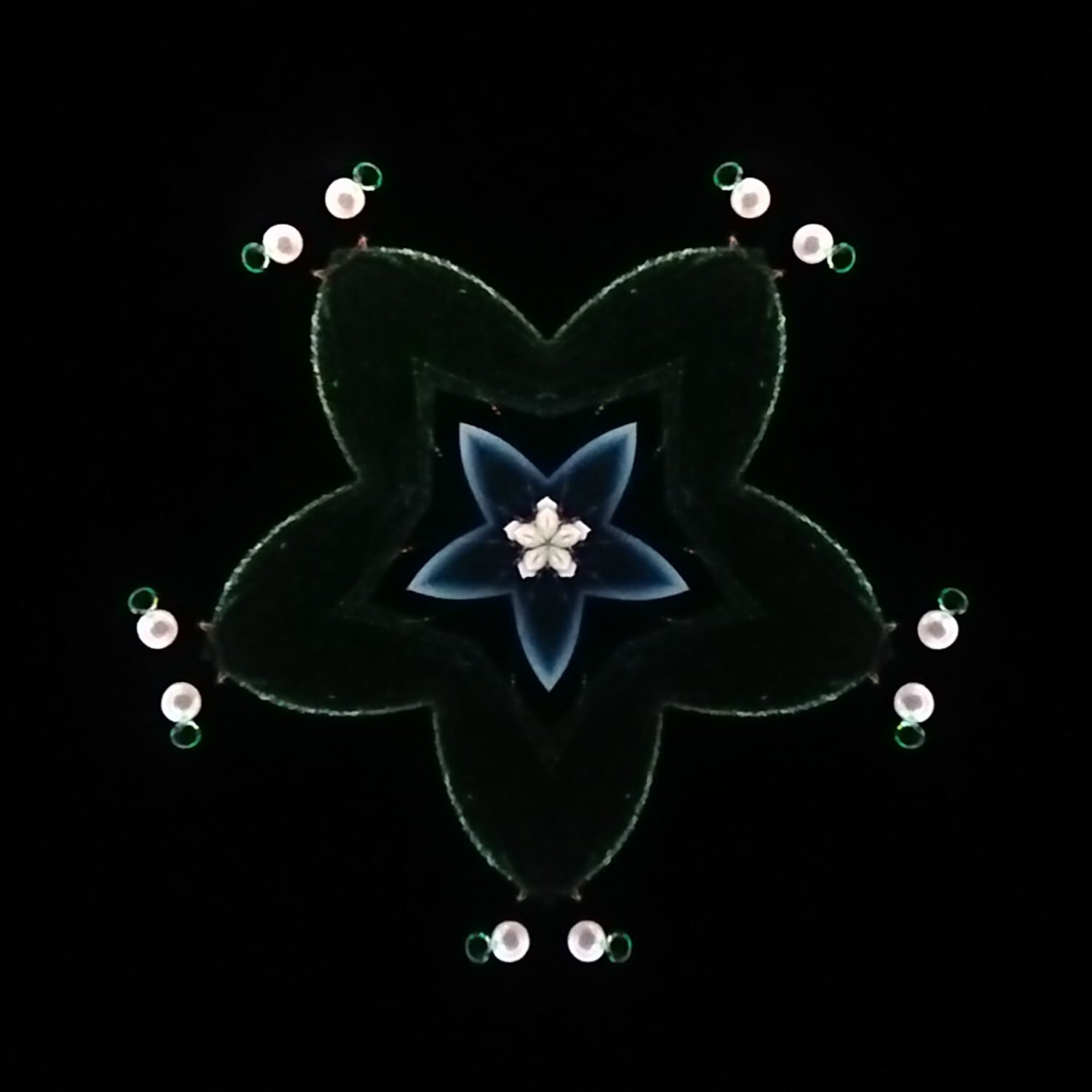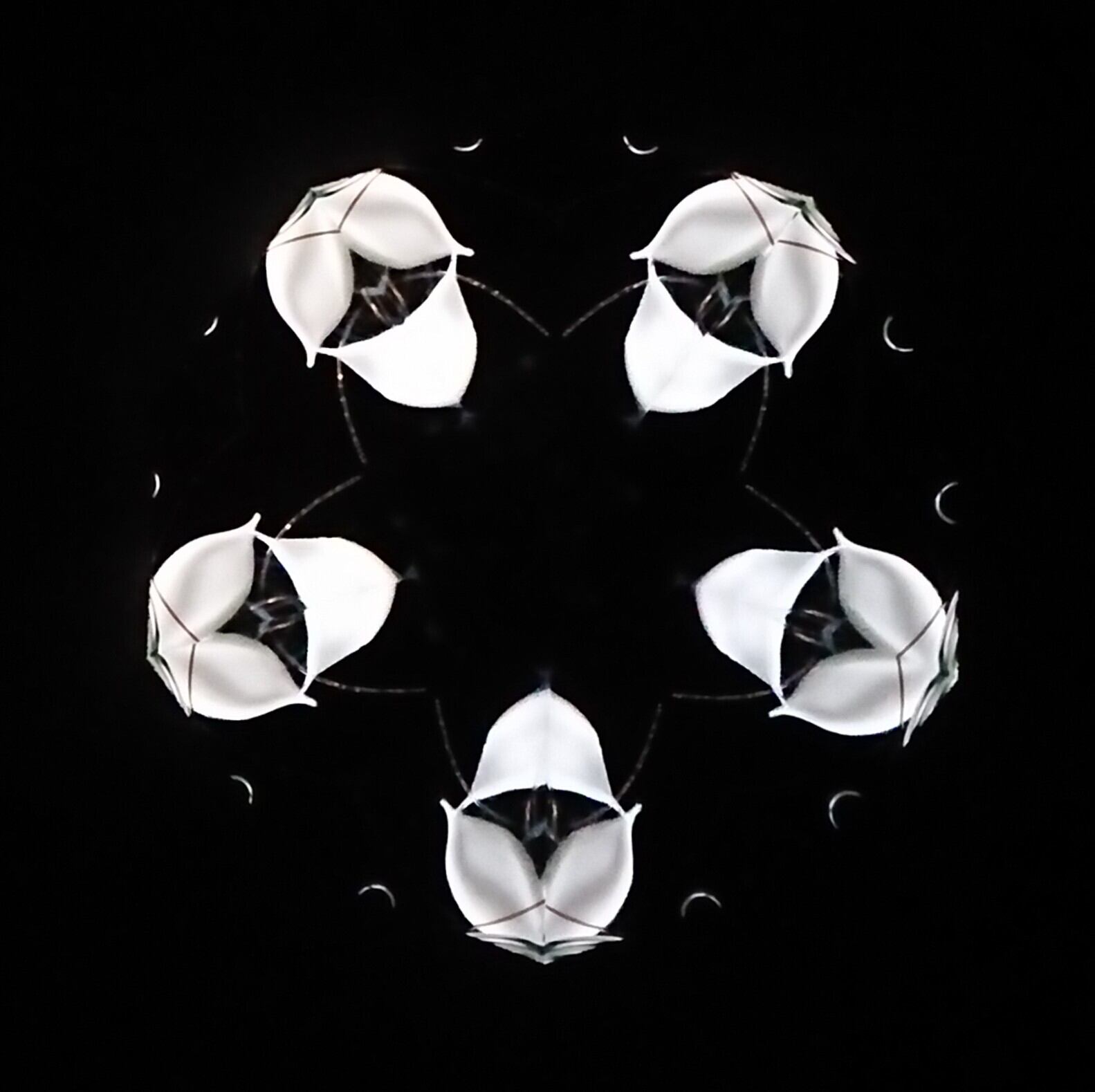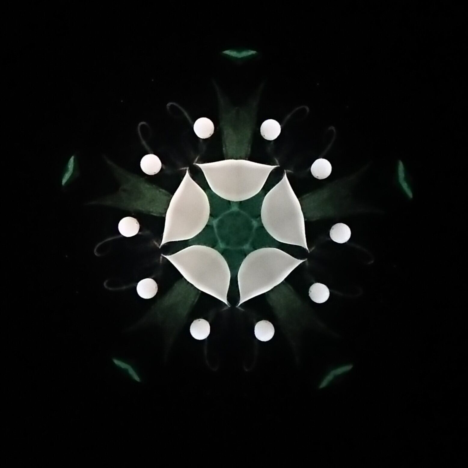高濃度のグリセリンの中を、白と緑のオブジェクトが重なり合いながらゆっくり動き、変化してゆきます。