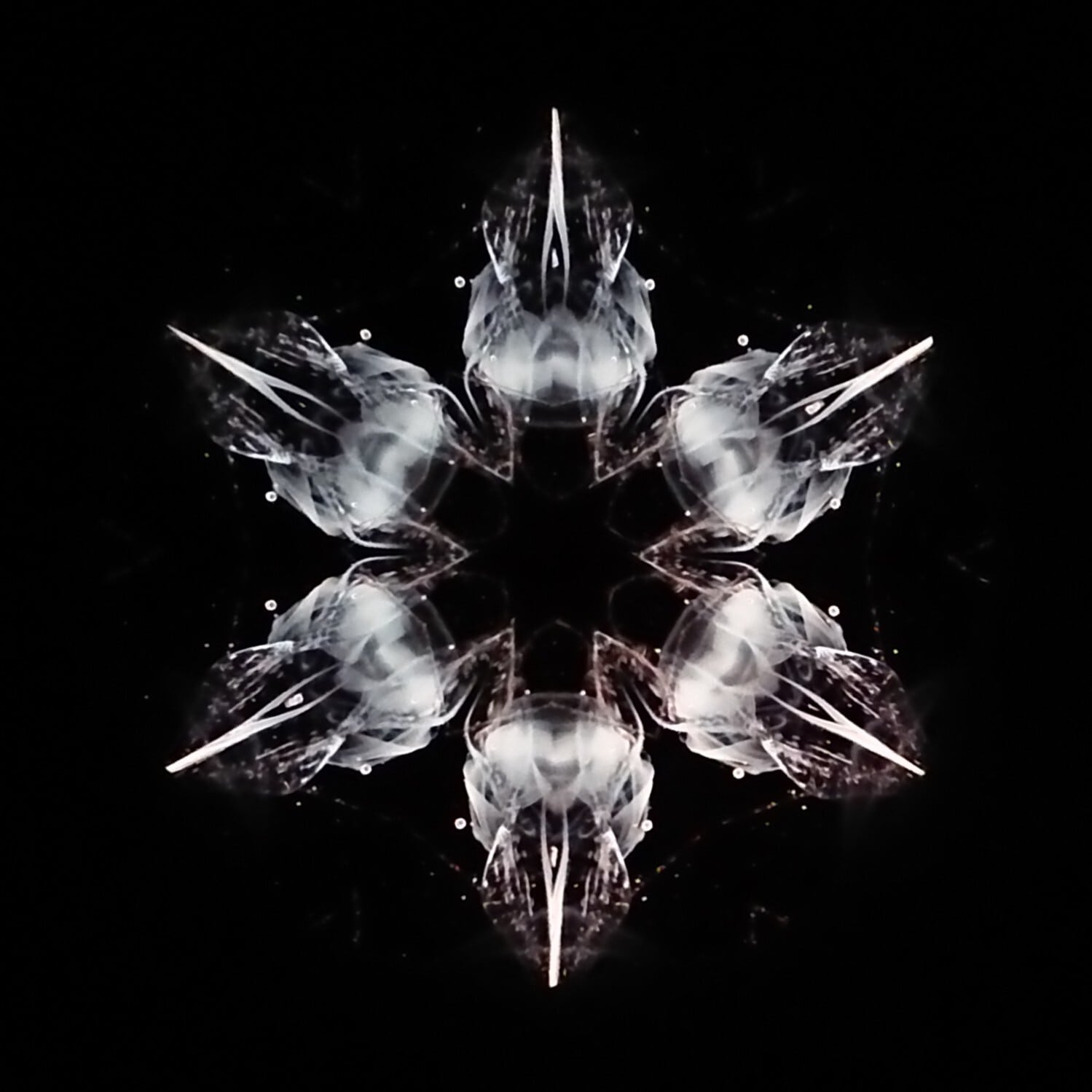 高濃度のグリセリンの中を、白いオブジェクトが重なり合いながらゆっくり動き、変化してゆきます。